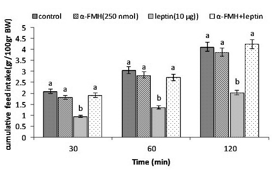 Figure 1. Effects of intracerebroventricular injection of control solution, α-FMH (250 nmol), and leptin (10 µg), as well as the co-injection of the α-FMH+leptin on cumulative food intake (gr/100gr BW) in neonatal chicks. Control: normal saline. α-FMH: alpha-Fluoromethylhistidine. Data are expressed as mean±SEM. Different letters (a and b) indicate significant differences between treatments at each time (P<0.05).