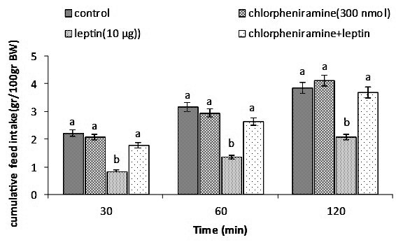 Figure 2. Effects of intracerebroventricular injection of control solution, chlorpheniramine (300 nmol), and leptin (10 µg), as well as the co-injection of the chlorpheniramine+leptin on cumulative food intake (gr/100gr BW) in neonatal chicks. Control: normal saline. Chlorpheniramine: H1 receptor antagonist. Data are expressed as mean±SEM. Different letters (a and b) indicate significant differences between treatments at each time (P<0.05).