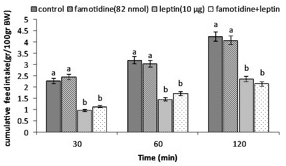 Figure 3. Effects of intracerebroventricular injection of control solution, famotidine (82 nmol), and leptin (10 µg), as well as the co-injection of the famotidine+leptin on cumulative food intake (gr/100gr BW) in neonatal chicks. Control: normal saline. Famotidine: H2 receptor antagonist. Data are expressed as mean±SEM. Different letters (a and b) indicate significant differences between treatments at each time (P<0.05).