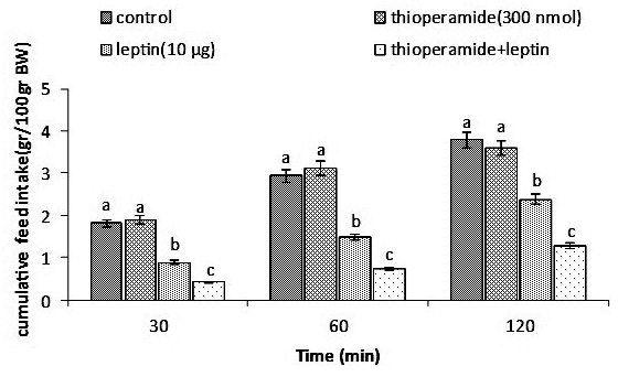 Figure 4. Effects of intracerebroventricular injection of control solution, thioperamide (300 nmol), leptin (10 µg), as well as the co-injection of the thioperamide + leptin on cumulative food intake (gr/100gr BW) in neonatal chicks. Control: normal saline. Thioperamide: H3 receptor antagonist. Data are expressed as mean ± SEM. Different letters (a, b, and c) indicate significant differences between treatments at each time (P<0.05).