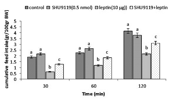 Figure 5. Effects of intracerebroventricular injection of control solution, SHU9119 (0.5 nmol), and leptin (10 µg), as well as the co-injection of the SHU9119+leptin on cumulative food intake (gr/100gr BW) in neonatal chicks. Control: normal saline. SHU9119: M3/M4 receptors antagonist. Data are expressed as mean±SEM. Different letters (a, b, and c) indicate significant differences between treatments at each time (P<0.05).