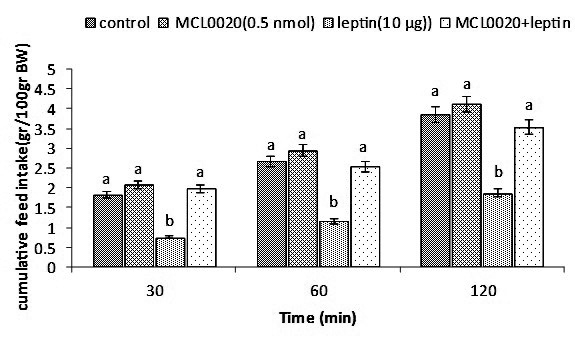 Figure 6. Effects of intracerebroventricular injection of control solution, MCL0020 (0.5 nmol), and leptin (10 µg), as well as the co-injection of the MCL0020+leptin on cumulative food intake (gr/100gr BW) in neonatal chicks. Control: normal saline. MCL0020: M4 receptor antagonist. Data are expressed as mean±SEM. Different letters (a and b) indicate significant differences between treatments at each time (P< 0.05).