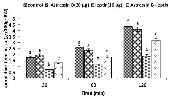 Figure 7. Effects of intracerebroventricular injection of control solution, astressin-B (30 µg), and leptin (10 µg), as well as the co-injection of the astressin-B+leptin on cumulative food intake (gr/100gr BW) in neonatal chicks. Control: normal saline. Astressin-B: CRF1/CRF2 receptors antagonist. Data are expressed as mean±SEM. Different letters (a, b, and c) indicate significant differences between treatments at each time (P< 0.05).