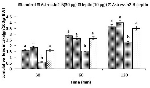 Figure 8. Effects of intracerebroventricular injection of control solution, astressin2-B (CRF2 receptor antagonist; 30 µg), and leptin (10 µg), as well as the co-injection of the astressin2-B+leptin (10 µg) on cumulative food intake (gr/100gr BW) in neonatal chicks. Control: normal saline. Astressin2-B: CRF2 receptor antagonist. Data are expressed as mean±SEM. Control: normal saline. Different letters (a and b) indicate significant differences between treatments at each time (P< 0.05).