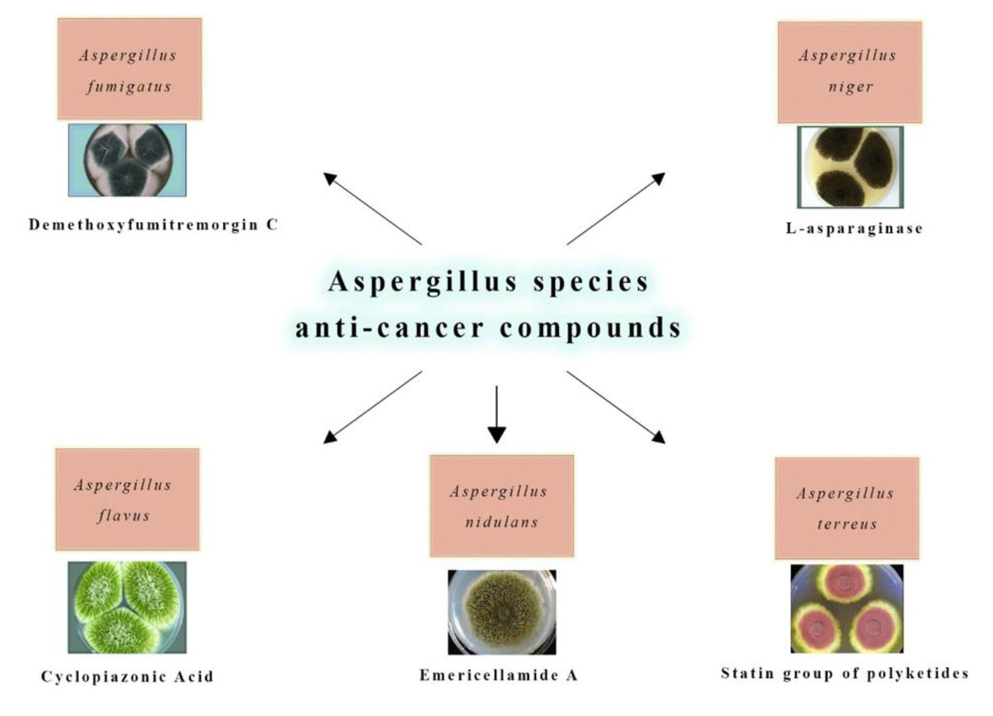 Figure 1. Some Aspergillus species produce compounds with potential anti-cancer properties: Aspergillus fumigatus (demethoxyfumitremorgin C), Aspergillus nidulans (emericellamide A), Aspergillus terreus (statins of polyketides), Aspergillus flavus (cyclopiazonic acid), and Aspergillus niger (L-asparaginase).