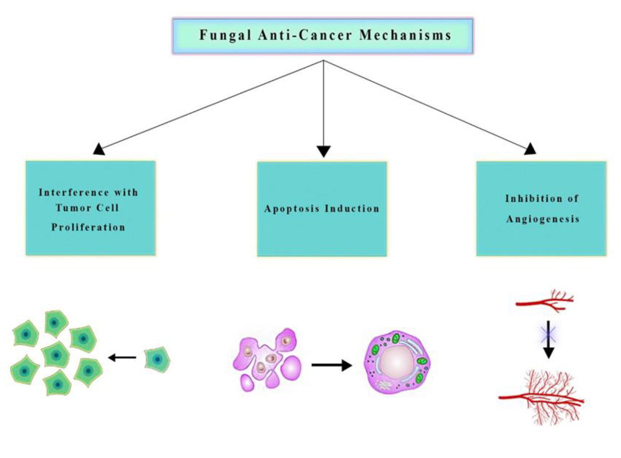 Figure 2. Compounds derived from Fungi exhibit various anti-tumor mechanisms, including the induction of apoptosis through intrinsic and extrinsic pathways, the inhibition of angiogenesis by targeting proangiogenic signaling pathways, and the interference with tumor cell proliferation by blocking essential cellular processes.