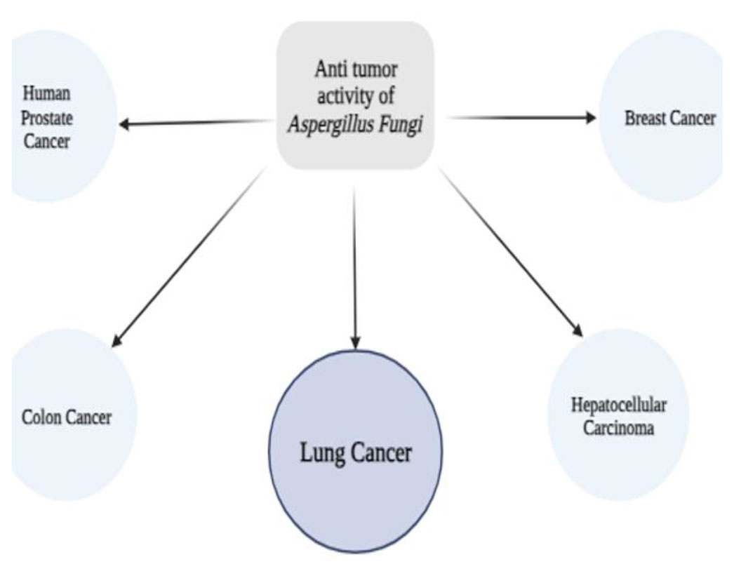 Figure 3. Various cancer types, including lung, breast, prostate, colorectal, and hepatocellular carcinoma, may respond to Aspergillus-derived compounds.