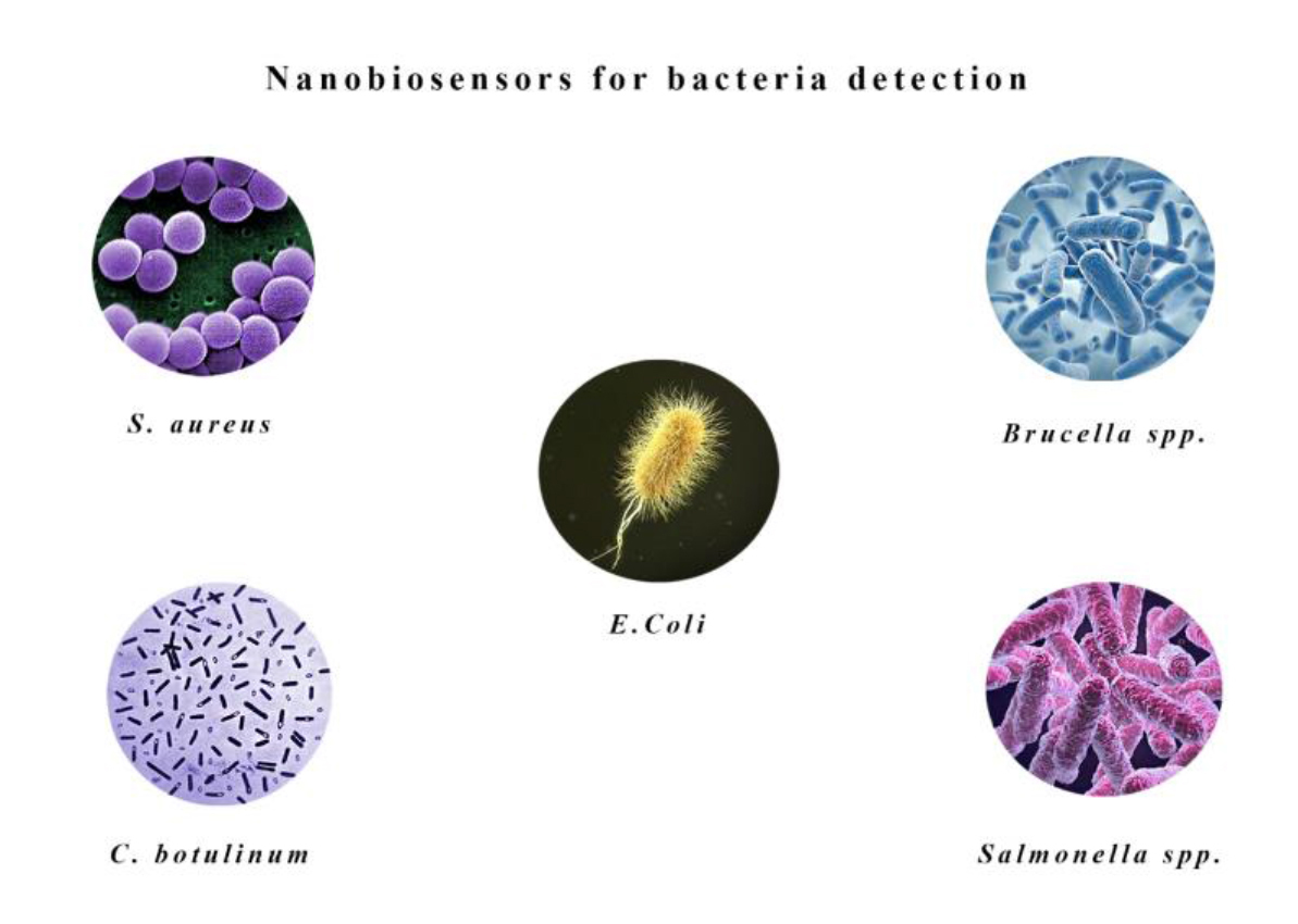 Figure 1.Advances in Nanobiosensors for Bacterial Detection.The development of nanobiosensors has enabled the rapid detection of pathogenic bacteria, including S. aureus, Brucella spp., C. botulinum, Salmonella spp., and E. coli. These biosensors represent a significant innovation in the field, offering highly sensitive and rapid detection methods with considerable potential for application in areas such as food safety, clinical diagnostics and environmental monitoring.