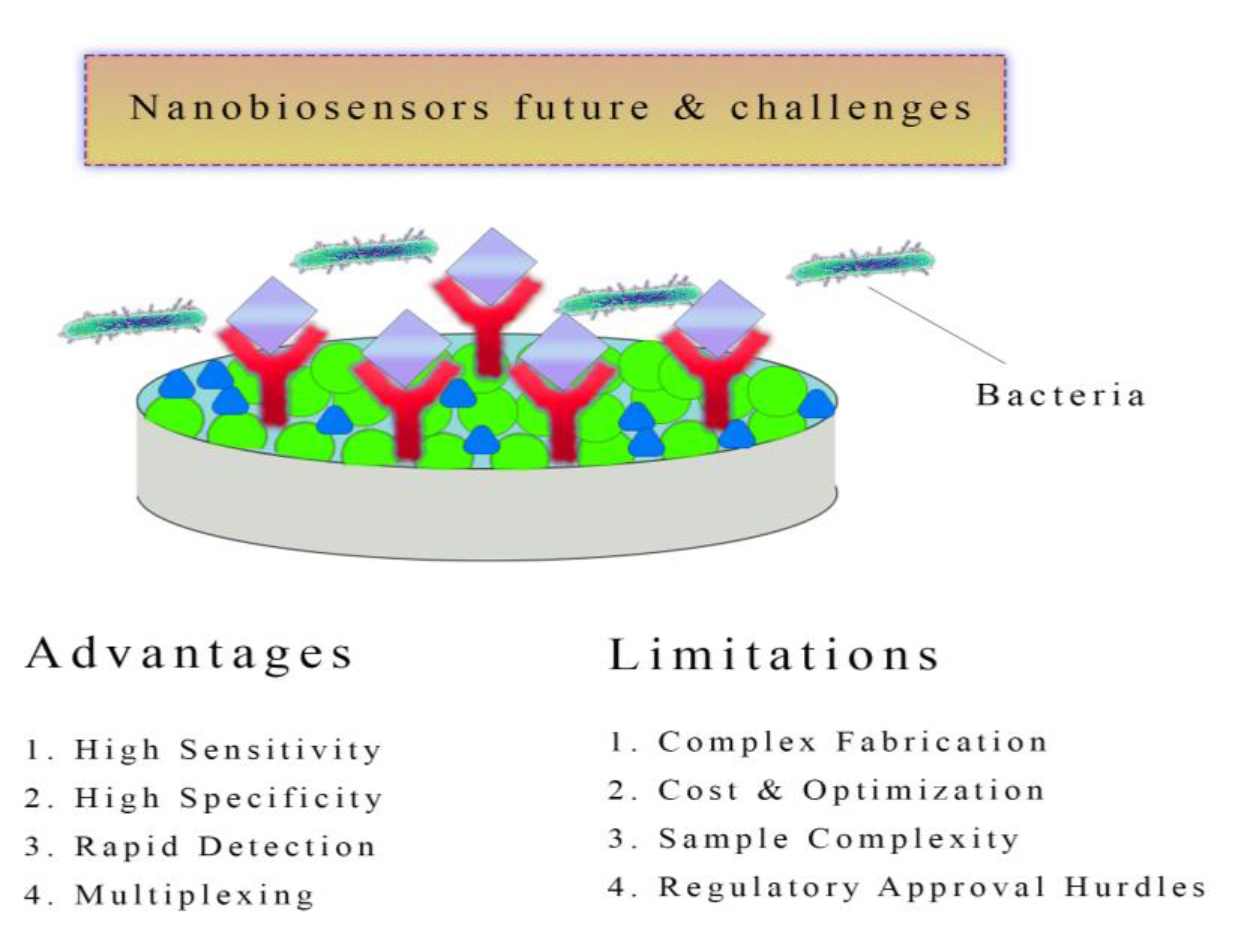 Figure 2.Advantages and Limitations of Nanobiosensors for Bacterial Detection.Nanobiosensors offer advantages such as high sensitivity, specificity, rapid detection, and multiplexing capabilities, making them promising tools for bacterial detection. However, limitations including complex fabrication processes, cost and optimization challenges, sample complexity, and regulatory approval hurdles must be addressed for their widespread adoption and practical use in bacterial detection applications.