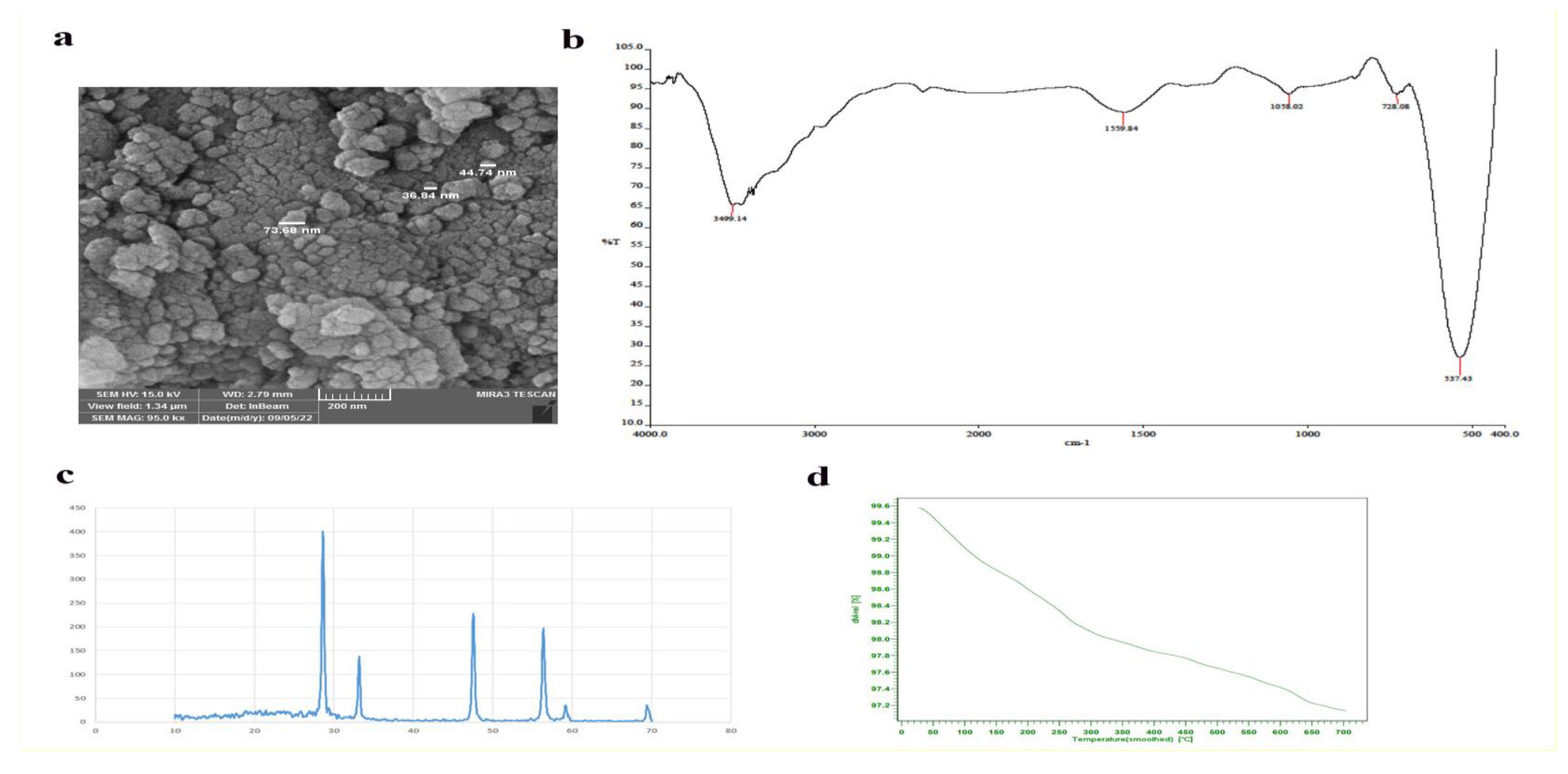 Figure 1. Nanoparticles Characterization. a) FE-SEM image, b) FTIR spectrum, c) XRD patterns, and d) Thermal analysis of synthesized CeO2 NPs.