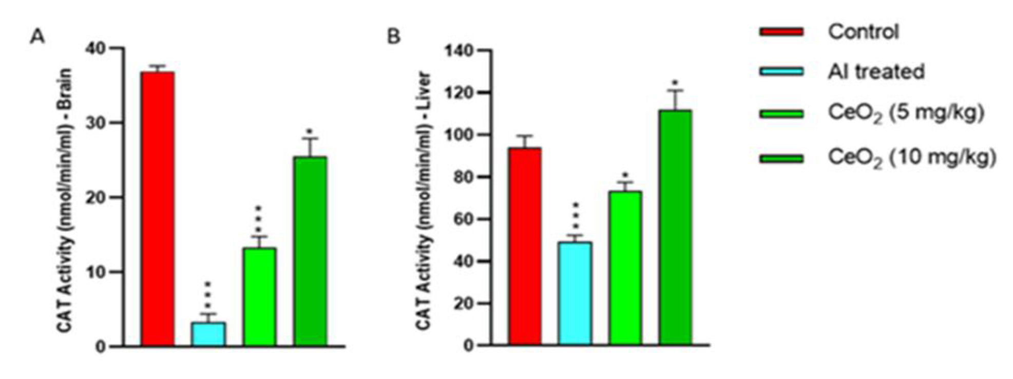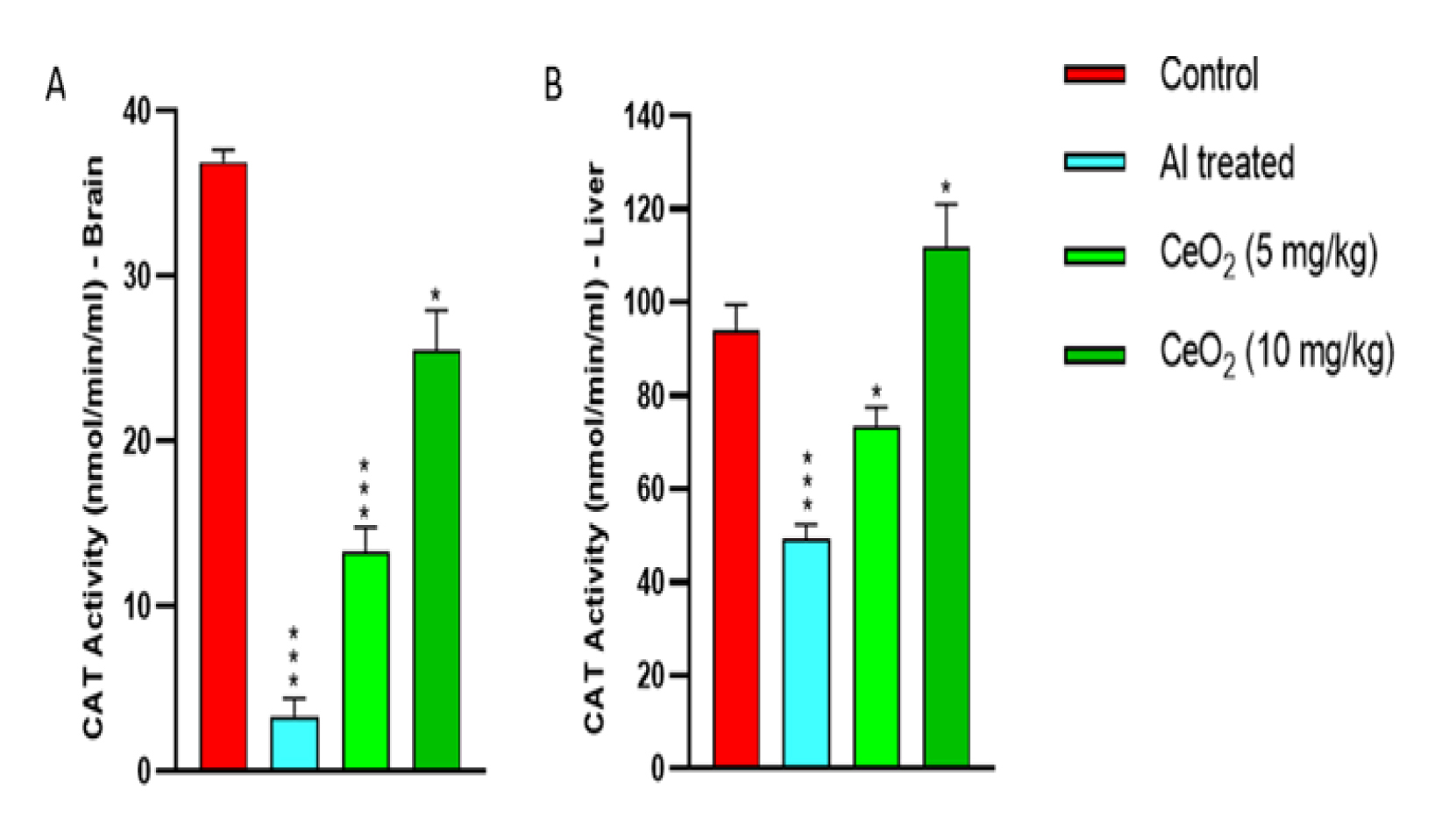 Figure 2. The graphs illustrate the CAT activity in the brain (A) and liver (B) tissues of rats exposed to aluminum and received CeO2 NPs.