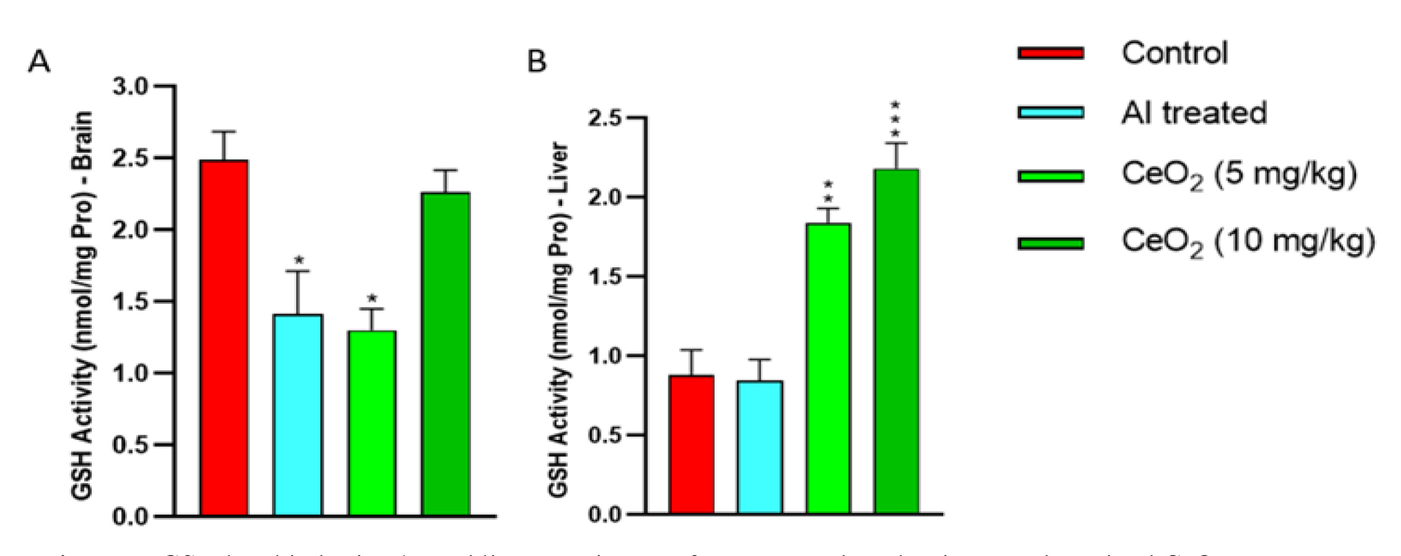 Figure 4. GSH level in brain (A) and liver (B) tissues of rats exposed to aluminum and received CeO2 NPs.