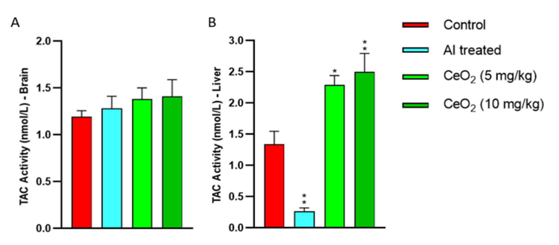 Figure 5. TAC level in brain (A) and liver (B) tissues of rats exposed to aluminum and received CeO2 NPs.