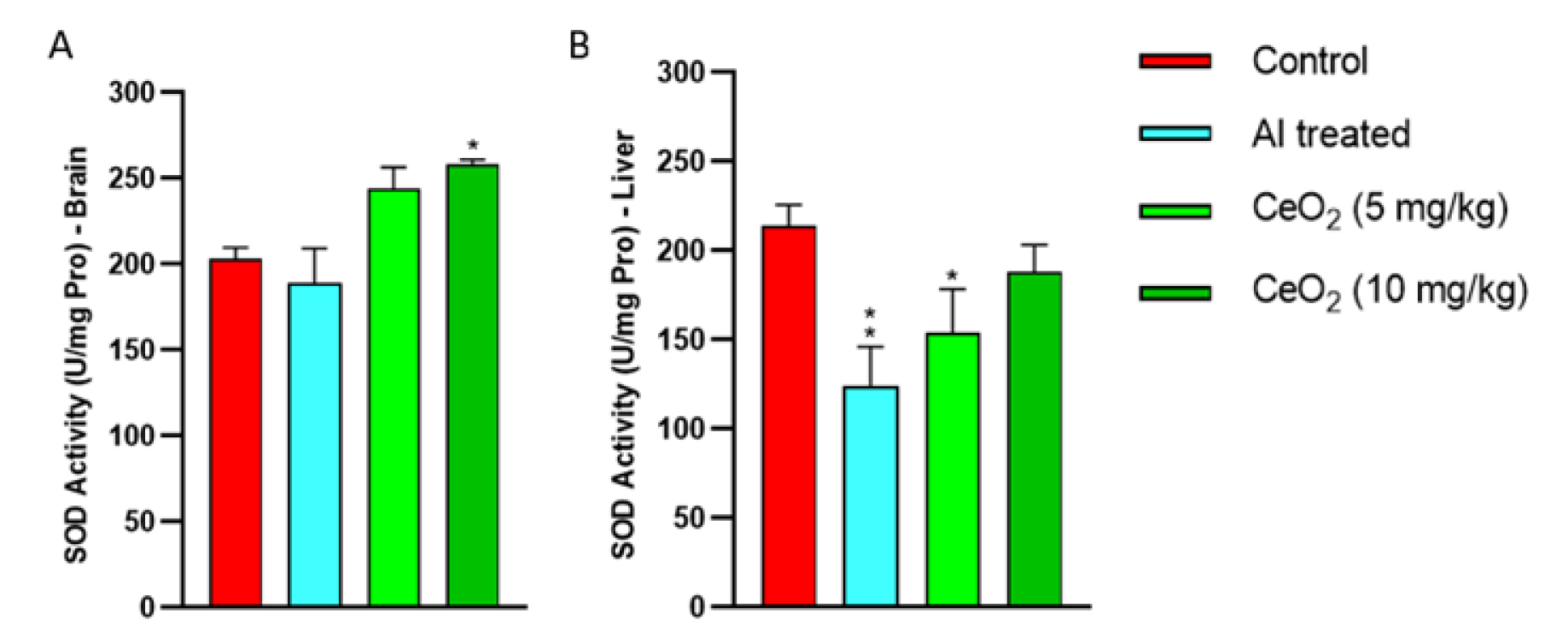 As illustrated in Figure 6, the level of superoxide dismutase (SOD) activity in the brain and liver tissues of rats is shown. These rats had been exposed to aluminum and subsequently treated with cerium oxide nanoparticles (CeO2 NPs). Rats that had been administered aluminum exhibited a significant decrease in SOD activity in their liver tissue; however, only a minor decline was observed in their brain tissue. The administration of CeO2 nanoparticles has been demonstrated to result in elevated superoxide dismutase (SOD) activity in the tissues of rats (brain and liver).