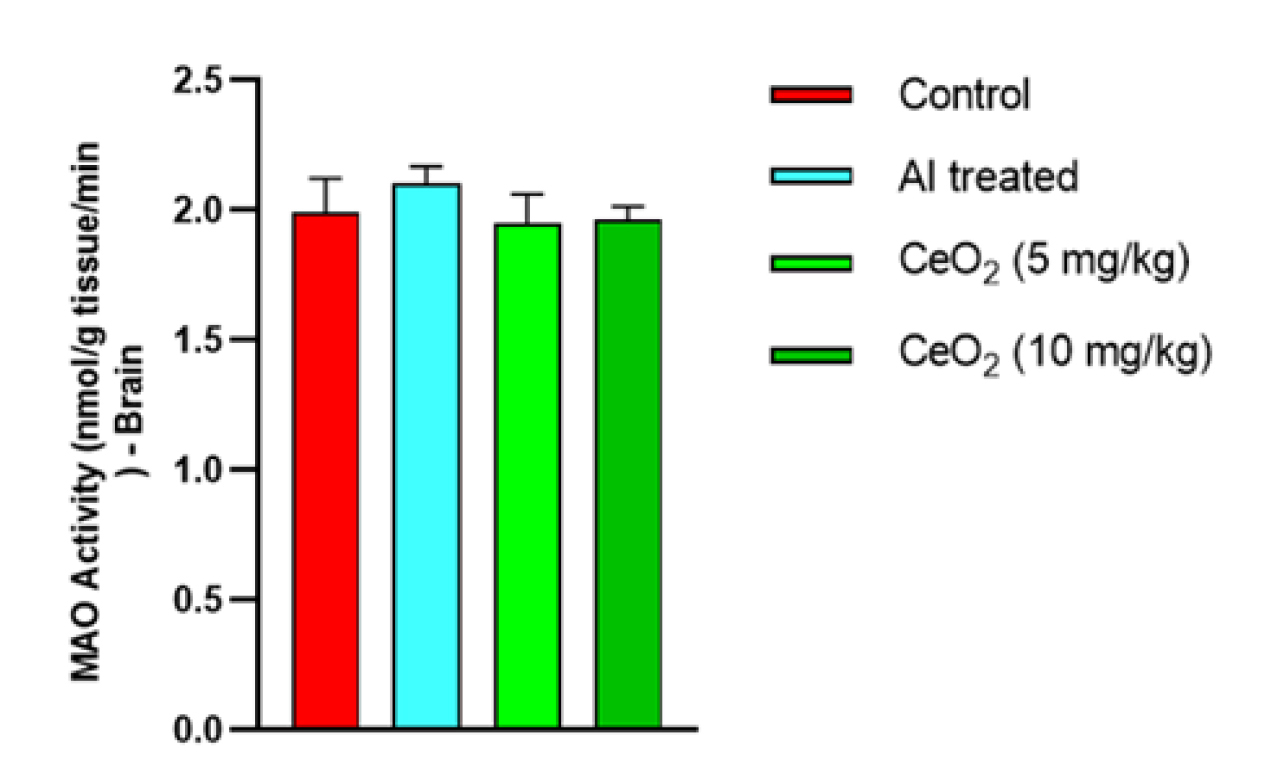 As illustrated in Figure 7, the degree of activity of the MAO enzyme in the brain tissue of rats that received aluminum and CeO2 NPs is depicted. As demonstrated in Figure 1, the incorporation of aluminum and CeO2 nanoparticles did not result in a discernible change in the level of MAO activity.