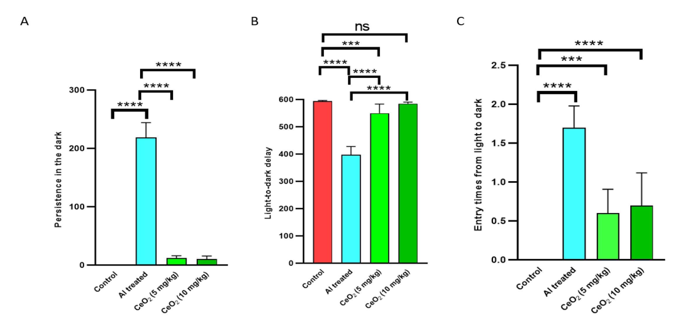 Figure 8. The graphs illustrate of memory and behavioral patterns of animals exposed to aluminum or received cerium oxide NPs. A) Persistence in the dark chamber, B) Light-to-dark delay and C) Entry times from light to dark.