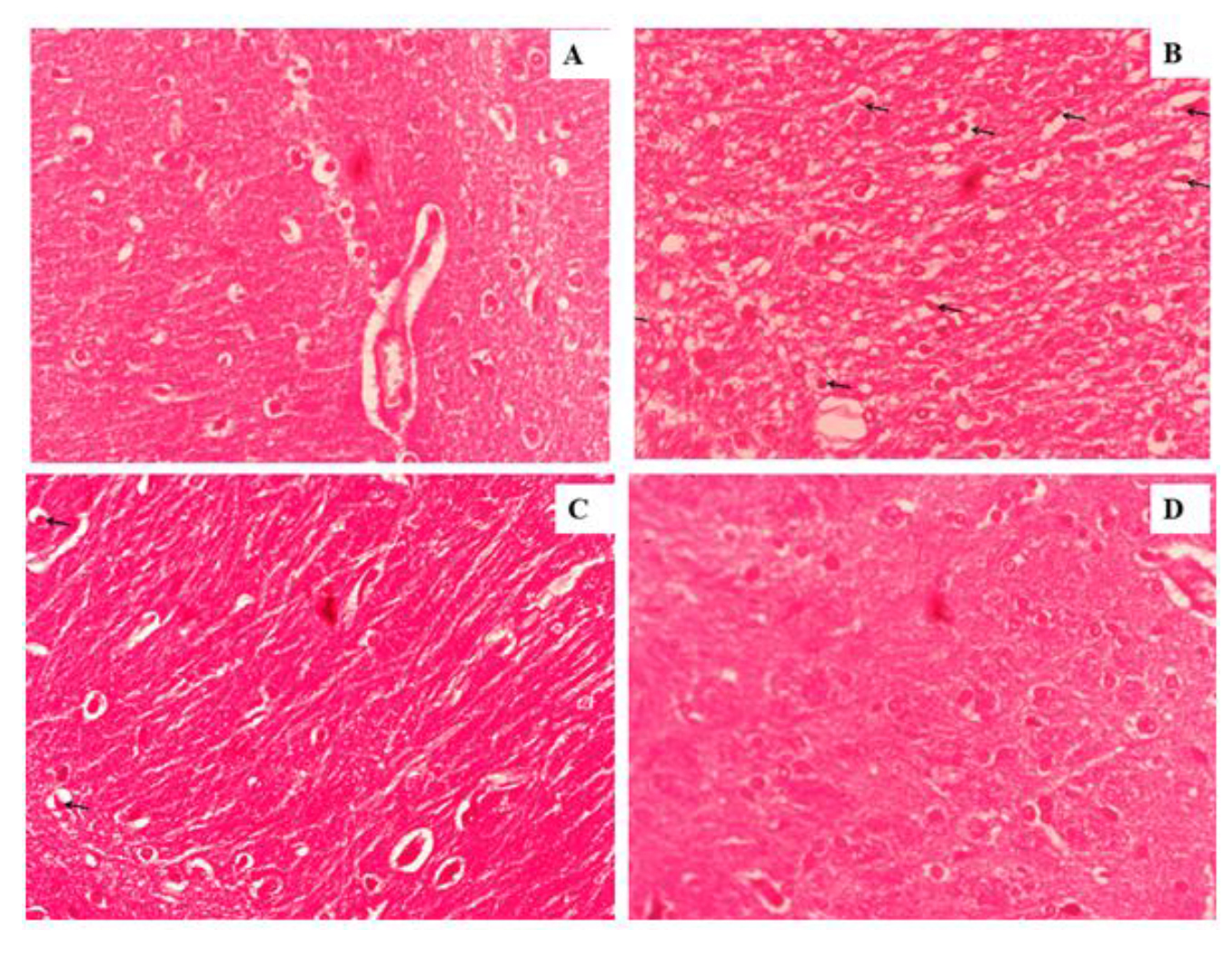 Figure 9. Photomicrographs of hippocampus tissue following hematoxylin and eosin staining. Control group (A), Al treated group showing increased apoptotic neurons with dystrophic changes in the form (arrows) (B), CeO2 NPs 5 mg/kg (C) and CeO2 NPs 10 mg/kg, magnification 400× (D).