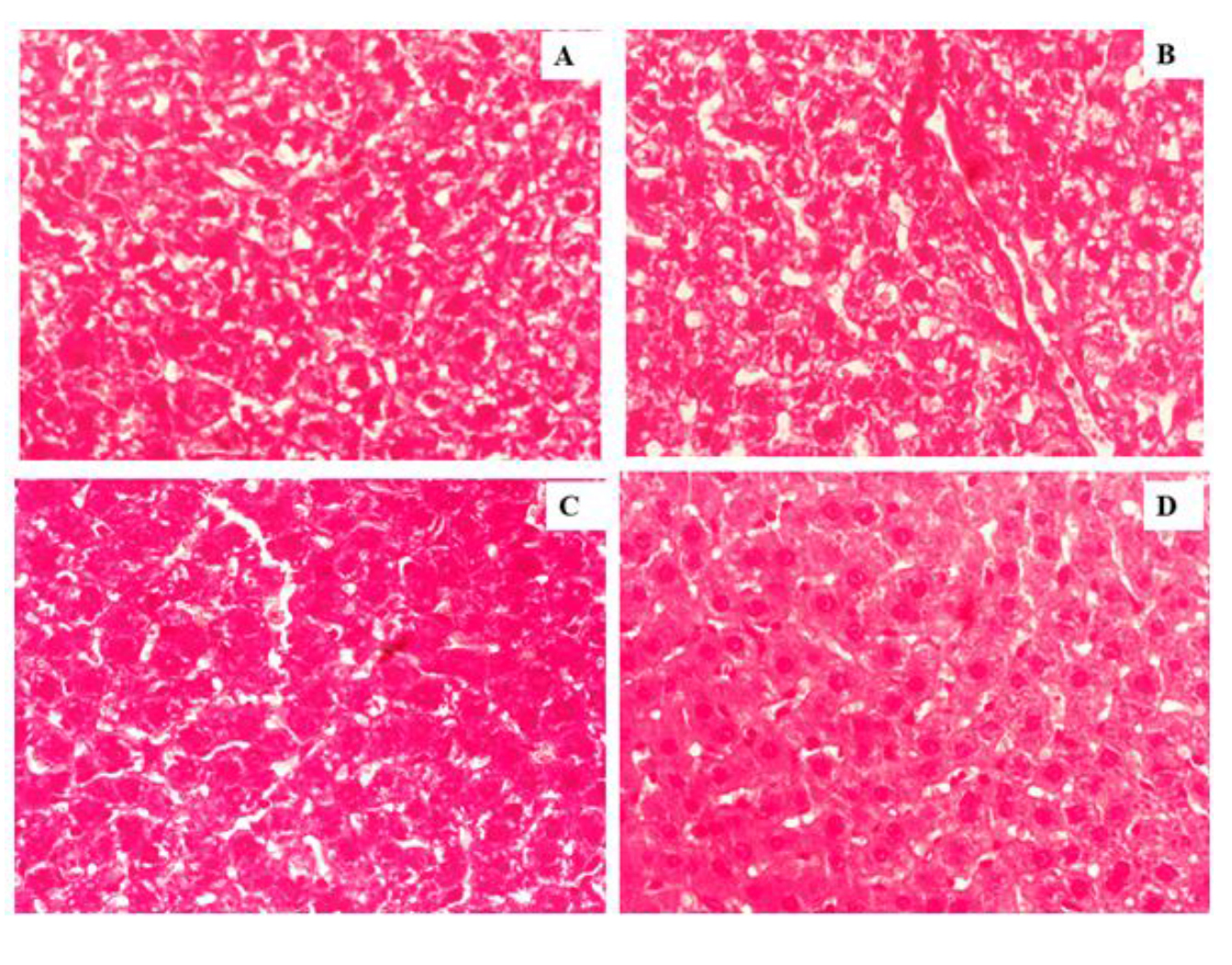 Figure 10. Photomicrographs of liver tissue following hematoxylin and eosin staining showed no alteration in any groups. Control group (A), Al treated group (B), CeO2 NPs 5 mg/kg (C) and CeO2 NPs 10 mg/kg, magnification 400× (D).