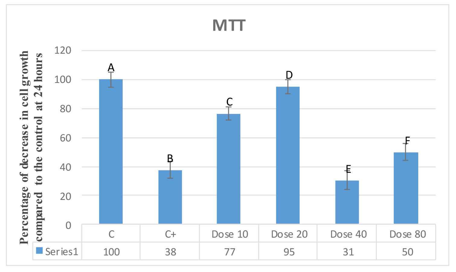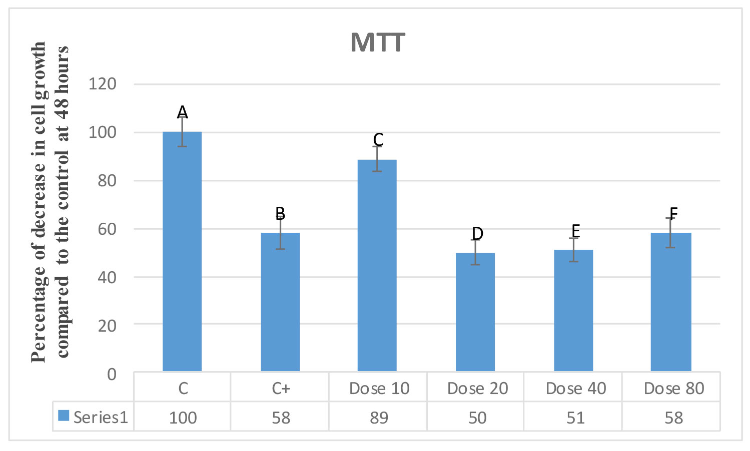 Figure 7. Percentage of cell growth reduction in MTT assay in 48 hours. The negative control (A), vincristine (B), and various concentrations of moringa extract concentrations (C-F) at 10, 20, 40, and 80 μM.