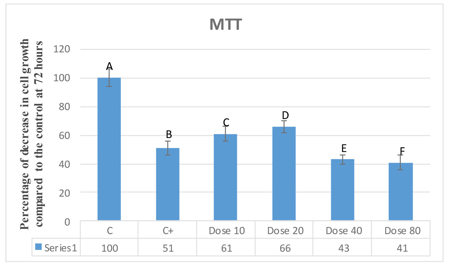 Figure 8. Percentage of cell growth reduction in MTT assay in 72 hours. The negative control (A), vincristine (B), and various concentrations of moringa extract concentrations (C-F) at 10, 20, 40, and 80 μM.