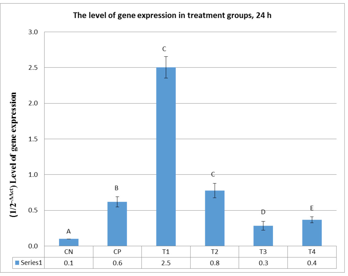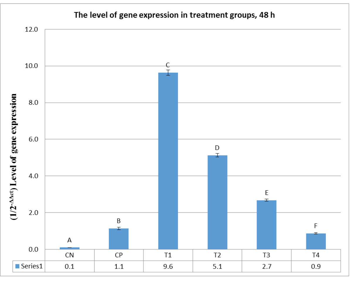 Figure 10. The amount of gene expression (caspase 3) in 24 hours. The negative control (A, CN), vincristine (B, CP), and various concentrations of moringa extract concentrations (C-F, T1-T4) at 10, 20, 40, and 80 μM.