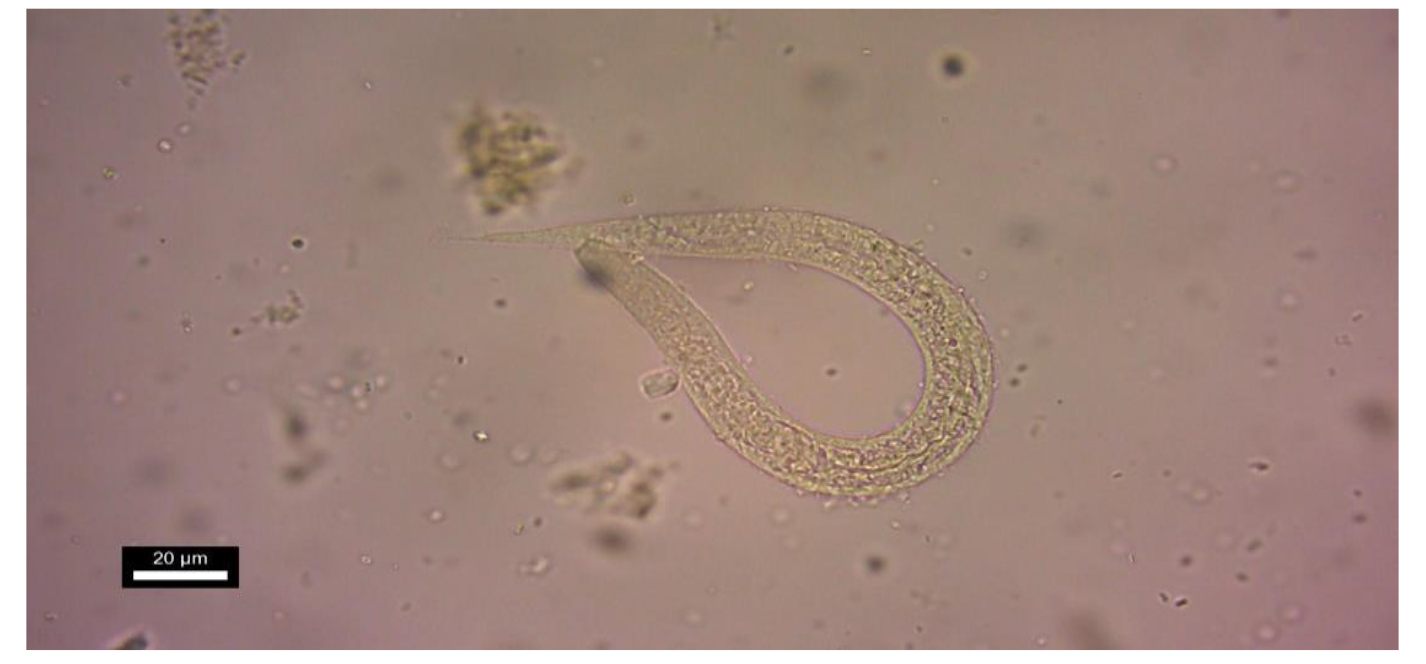 Figure 1. The rhabditiform larva of S. stercoralis was acquired from a rinsed agar plate culture and treated with Lactophenol stain for observation. The scale bar represents 20 μm.