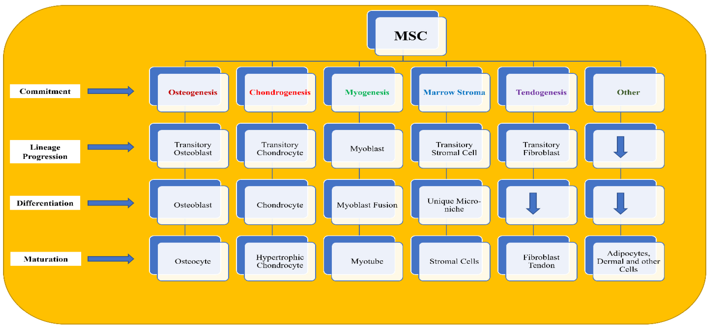 Figure 1. In a series of lineage transitions, adult mesenchymal stem cells (MSCs) can develop into muscle, tendon, marrow stroma, bone, cartilage, fat, and other connective tissues.