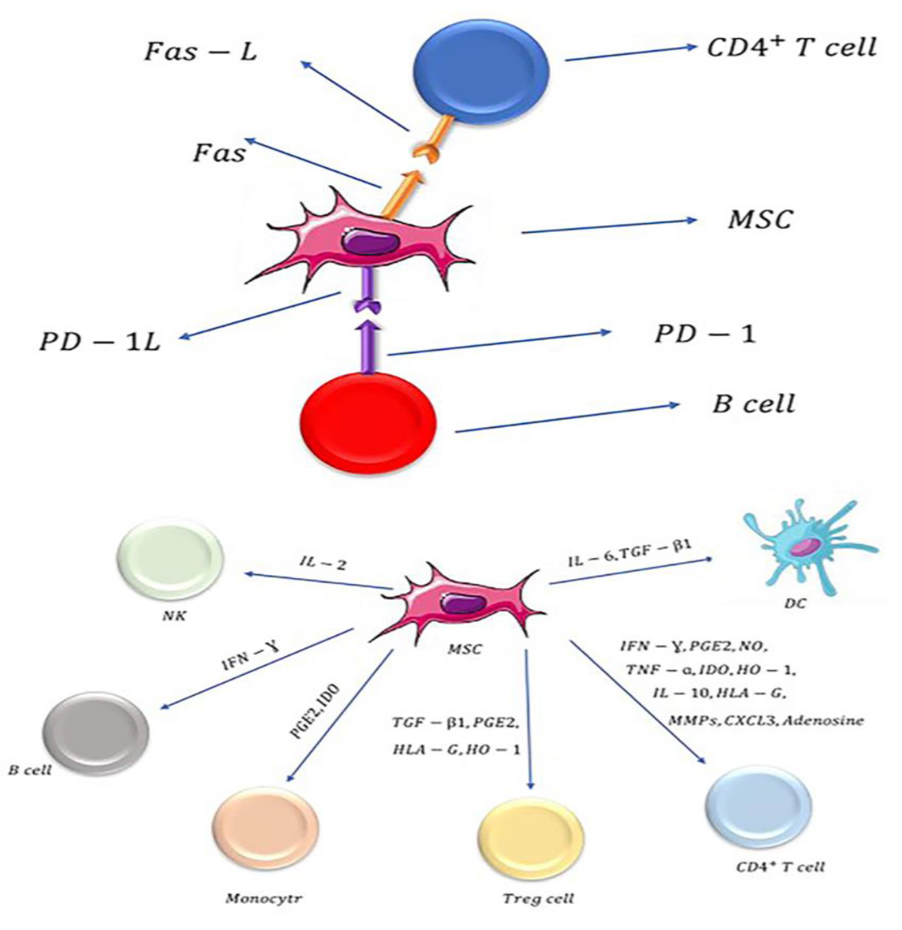 Figure 3. Mechanism of MSC-mediated immune cell regulation. (a) Direct cell-cell contact, (b) interactions between soluble components.