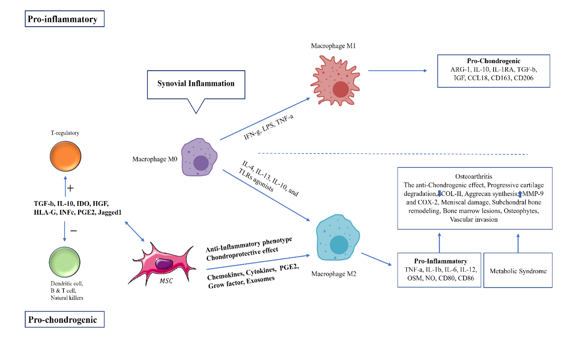 Cartilage damage is a complex illness in the field of medicine. Cartilage damage manifests primarily in joint regions, and impairment to articular cartilage curtails the capacity of cartilage tissue to regenerate. The immunological milieu in tissue regeneration has been the subject of much research in recent years. This research has led us to consider the hypothesis that the recovery of cartilage can be improved by establishing a suitable milieu. Pluripotent stem cells possess the capacity to differentiate into a range of cell types, including adipocytes, bone, and cartilage. These cells are derived from mesoderm and are characterized by their mesenchymal nature. They are generated from perivascular tissues, as outlined in reference ( 35 ). MSC-based cartilage has been demonstrated to promote polarization of macrophages to an M2 phenotype, in which macrophages upregulate CD206, exhibit reduced IL-1β release, increased IL-10 production, and decreased expression of M1 to M2-associated genes. It has been demonstrated that this substance exhibits anti-inflammatory properties, including transitions. Research indicates that MSC-based tissue engineering constructions can enhance inflammation brought on by adherence and cartilage repair by M2-polarized macrophages ( 36 ). Bone marrow stromal cell-based genetically engineered cartilage has been demonstrated to suppress inflammation in vivo by increasing M2 polarization of macrophages, resulting in improved survival when compared to the use of kondrocytes as germ cells. However, with regard to the immunosuppressive properties of mesenchymal stem cells, there is a paucity of research on the immunogenicity of kondrogenic cells, which has led to conflicting conclusions ( 37 ). A study on MSC-mediated cartilage injury repair demonstrated that the secretion of exosome by her MSCs to enhance tissue regeneration was also implicated in regulating the immunological reaction. Macrophages exhibit a high degree of flexibility and perform critical functions in the context of innate immunity. A similar behavioral pattern has been observed among resident macrophages, including CD11b, CD14, CD16, and CD68 ( 38 ), as well as synovial macrophages. Furthermore, the study demonstrated that macrophages and mesenchymal stem cells exhibit a closer geographical proximity in normal and pre-OA knees compared to OA patients. Additionally, synovial macrophages were found to be diminished in pre-OA joints relative to normal knees ( 39 ). As demonstrated in the extant literature, the presence of synovial M1 macrophages has been shown to increase the production of proteolytic enzymes that cause articular degeneration. These enzymes include MMP3, matrix metalloproteinase-1, MMP9 aggrecanase, cyclooxygenase-2, and MMP13 ( 40 ). It has been demonstrated that the process of kondrogenesis in MSCs is subject to adverse influence from monocyte-derived pro-inflammatory and synovial macrophages (Figure 4) ( 41 ).