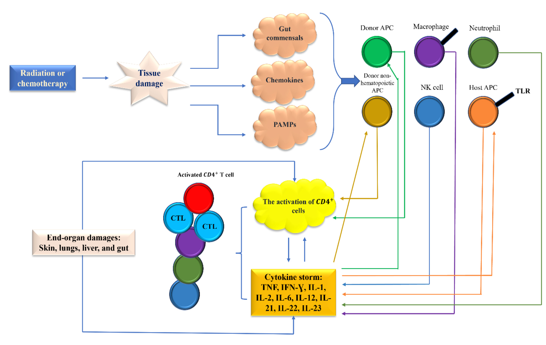 Figure 5. The whole GVHD acute cascade. The initiation and maintenance of acute graft-versus-host disease (GVHD) have been characterized as having four phases, each of which contains a positive feedback loop that keeps the process going.