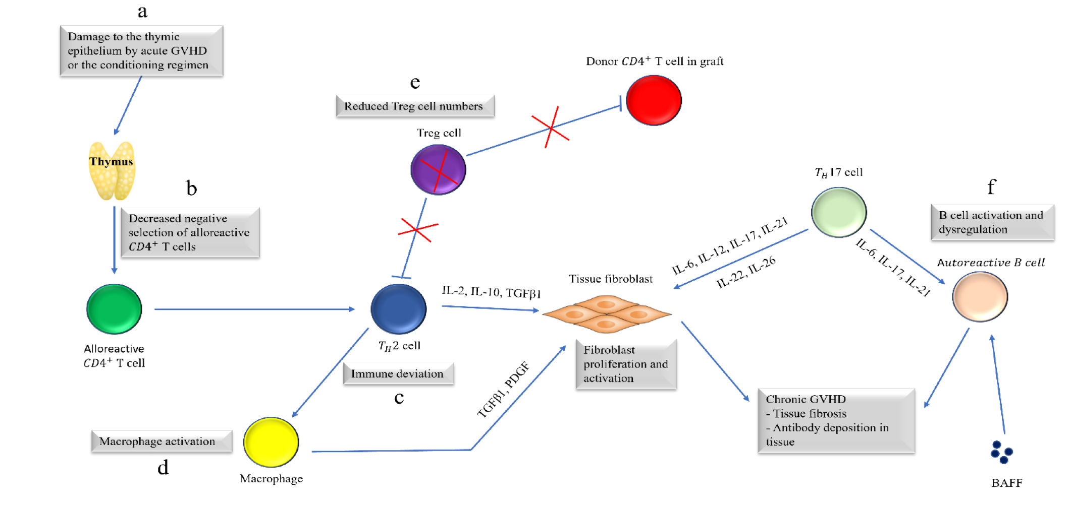 Figure 6. Key factors in the development of chronic GVHD. Six characteristics are specific to this illness, although the pathogenesis of chronic GVHD mostly relies on the polarization of CD4+ T cells into TH2 cells.