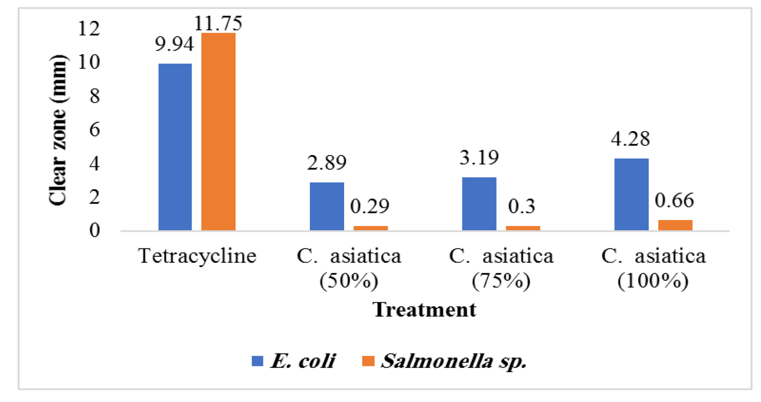 The antibacterial activity of Centella asiatica leaf meal extract with different concentrations against E. coli and Salmonella sp. bacteria is illustrated in Figure 1. The results of the study demonstrated that Centella asiatica leaf meal extract, at varying concentrations, exhibited antibacterial properties.