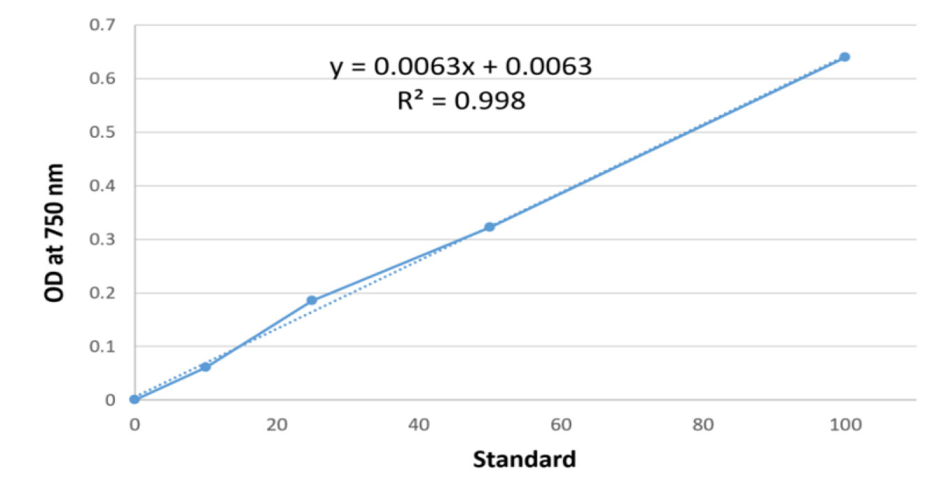 Subsequent to measuring the optical absorbance of each solution at 750 nm, the concentration of the available protein was determined based on dilutions of 1:5 and 1:10. This concentration was found to be 350 microgram per milliliter (µg/ml) (Table 1 and Figure 1).