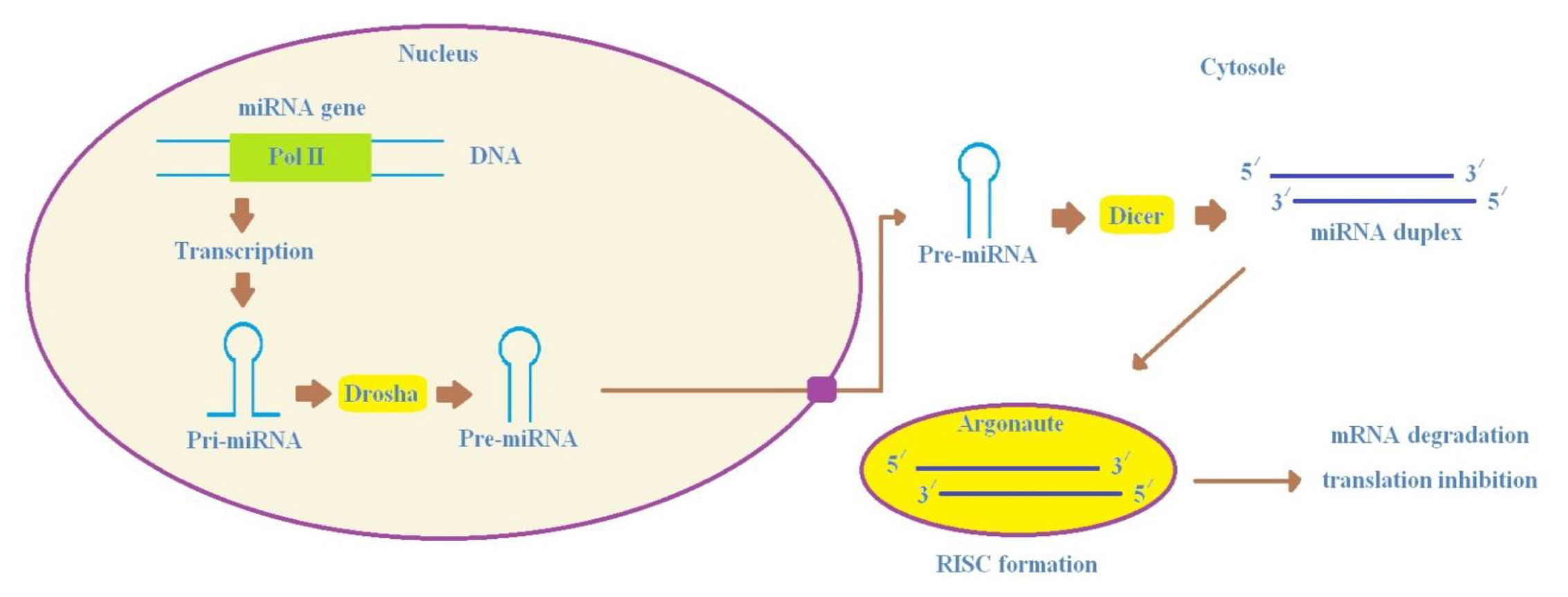As illustrated in Figure 1, the biogenesis of microRNAs (miRNAs) occurs in two locations: the nucleus and the cytoplasm. The process commences with RNA polymerase II transcribing the primary miRNA transcript, which is subsequently polyadenylated. This initial transcript is characterised by a sizeable stem-loop structure, spanning multiple kilobases.