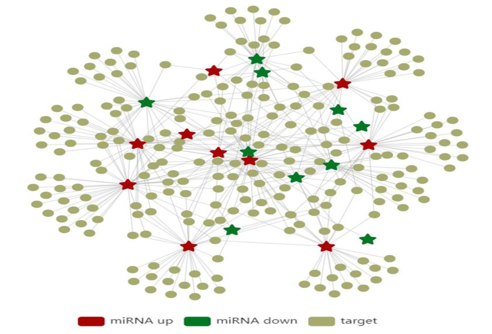 Figure 2. Network structure of upstream and downstream miRNAs along with their target genes.
