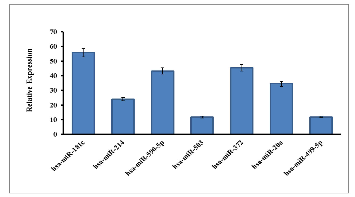 In the 30 samples examined, the expression levels of microRNAs (miRNAs) in cancer cells were found to be elevated in 14 samples, while in the remaining 16 samples, the expression levels of certain other miRNAs were found to be reduced. Figure 3 illustrates the expression levels of seven of these microRNAs. In the remaining seven cases, the expression levels were either too low or too high, with miR-21 and miR-27a exhibiting levels of 46756 and 2042, respectively.