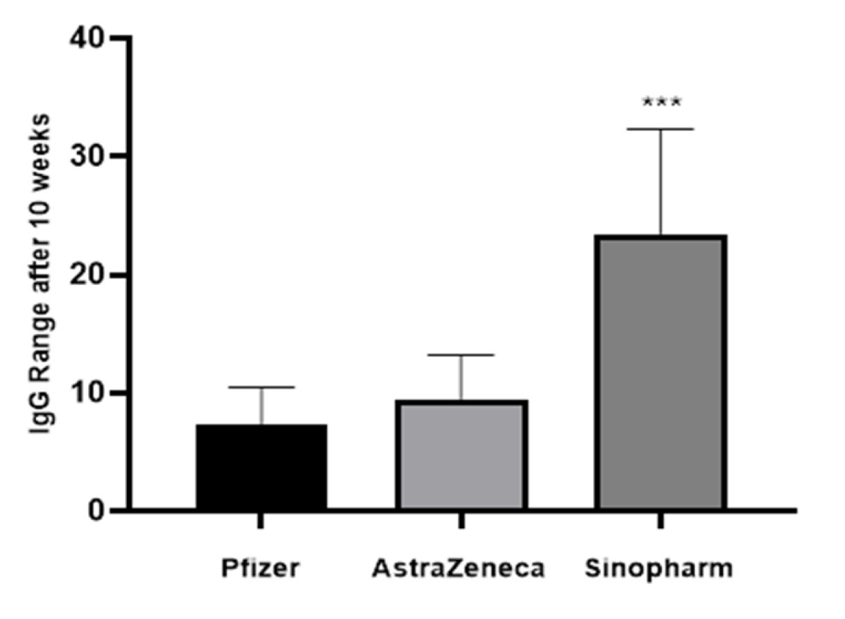 Serum concentrations of both IgM and IgG in different groups who received different vaccines were evaluated, with the mean of IgM concentration after 10 weeks in the control group (not vaccinated) and in those vaccinated with BNT162b2, ChAdOx1, and BBIBP-CorV being 0.018, 0.269, 0.236, and 0.242 mg/dL, respectively. The IgG concentration mean after 10 weeks in the control group (not vaccinated) and in the vaccinated groups with BNT162b2, ChAdOx1, and BBIBP-CorV were 0.23, 7.39, 9.48, and 23.48 mg/dL, respectively.In addition, a comparison analysis for the production of both IgM and IgG was conducted between participants who received different vaccines. The statistical analysis of the IgM levels after 10 weeks revealed no significant differences between the various vaccines (P value = 0.958) ( Figure 3). In contrast, it was observed that all participants had produced sufficient amounts of IgG against SARS-CoV-2, regardless of the vaccine type (BNT162b2, ChAdOx1, or BBIBP-CorV). Consequently, the level of IgG antibodies was found to vary among the various groups, as a statistically significant difference was identified (P<0.001) ( Figure 4). Furthermore, a statistically significant increase in IgG levels was observed in participants vaccinated with BBIBP-CorV compared to those vaccinated with BNT162b2 or ChAdOx1 (P<0.001), as illustrated in Figure 4. Furthermore, the utilization of ChAdOx1 has resulted in the generation of elevated levels of IgG in comparison to BNT162b2. A statistically significant discrepancy was identified between the two (P < 0.001) ( Figure 4).