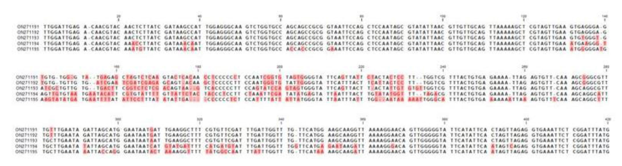 A subsequent analysis of the obtained sequences revealed the presence of four distinct subtypes, namely subtypes 1, 2, 3, and 5, among the existing isolates. The accession numbers of the five Blastocystis spp. isolates utilized in this study are documented in Gen Bank as follows: ON271191, ON271192, ON271193, ON271194, ON271195. The similarity percentage of the isolates was obtained by comparing the isolates available in the gene bank (Table 1). A comparison of the nucleotide changes in the sequences obtained from the studied isolates reveals the presence of significant nucleotide differences within the range of sequence 140 to 240, where deletions have occurred in the nucleotides of subtypes 1 and 2 compared to subtypes 3 and 5 within this range (Figure 1). Phylogenic analysis of the nucleotide sequence of the obtained isolates revealed a genetic affinity between subtypes 1 and 2. The same genetic affinity is also observed in the plotted tree between subtypes 3 and 5 (Figure 2).
