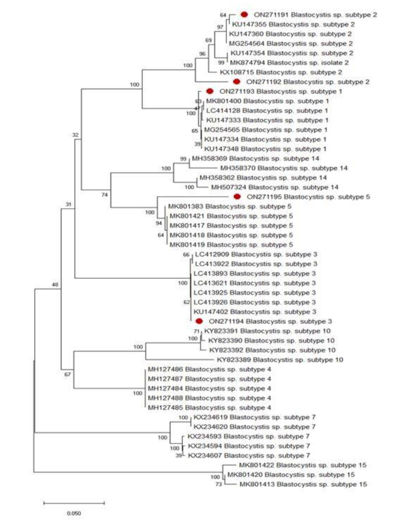 Initially, the five samples of Blastocystis spp. sequences obtained from the new isolates were multi-aligned with ClustalW software against those of humans, which had been previously deposited in GenBank. Subsequent to this, the nucleotide sequences were examined using Chromas biotechnology software version 2.4 and CLC genomic work bench software 11. Thereafter, the sequences were aligned using BLAST database, and finally, they were compared with Blastocystis spp. reference genotypes in gene bank. The genotyping of the sequences was conducted using CLC genomic work bench software 11, and a phylogenic tree was constructed using MEGA7 software with the Neighbor-Joining statistical method, which applied the Kimura 2-parameter method based on nucleic acid. The ABI 310 automated fluorescent sequencing system was utilized to sequence high-quality PCR products, employing the indicated primers. The similarity between sequences of other Blastocystis spp. was performed by the Basic Local Alignment Search Tool (BLAST) software provided by the National Center for Biotechnology Information (NCBI) in GenBank. The sequences were then analyzed by CLC Genomics Workbench 12 software and manually edited. Maximum likelihood reconstructions were performed using the phylogenetic program MEGA software version X, with trees generated using the neighbor-joining method and the Kimura 2-parameter model. Bootstrap values were estimated using 100 replicate data sets at each node. Furthermore, a comparison was made between our samples and similar isolates from Iran and other regions of the world.