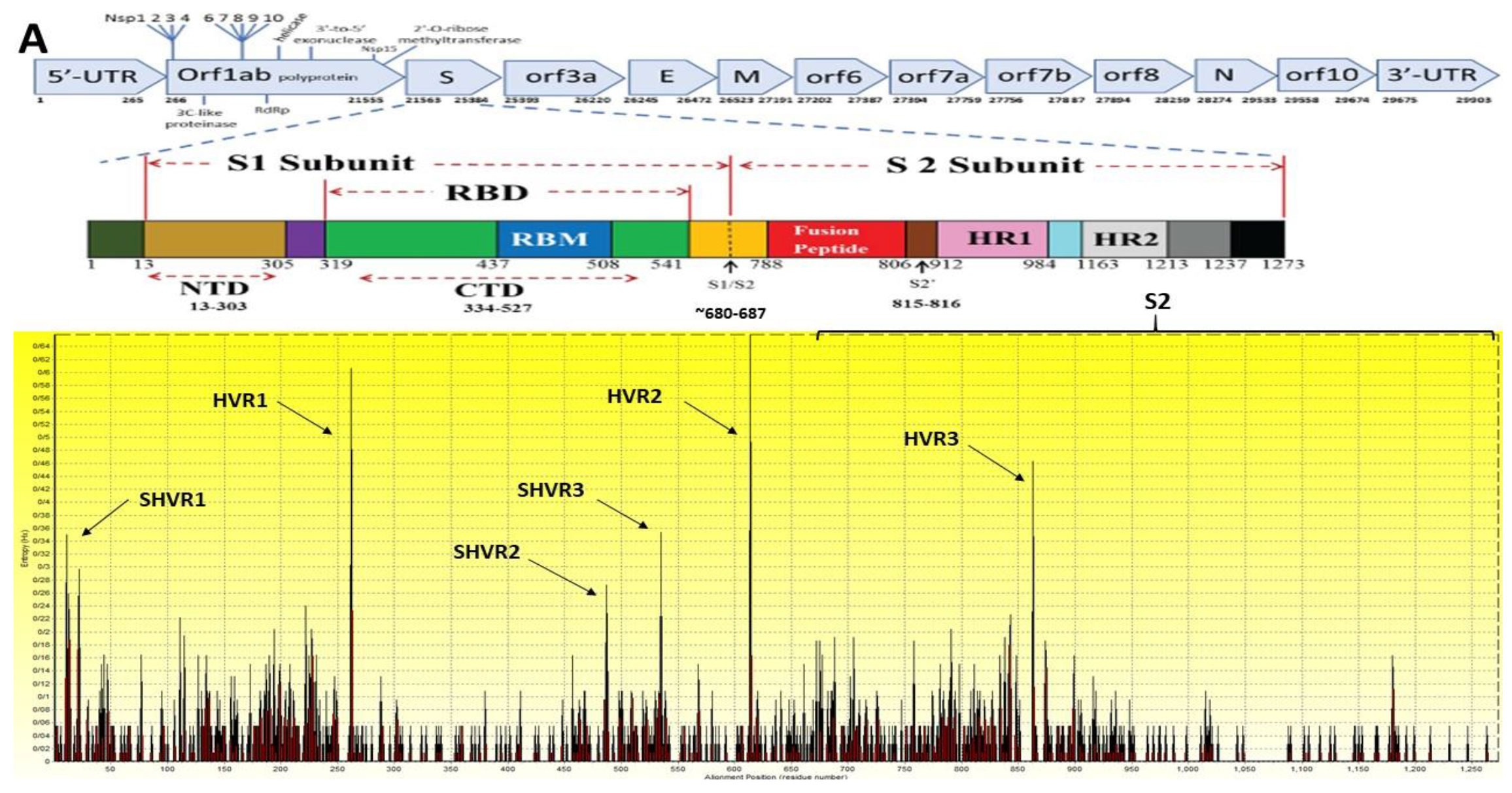 Figure 1. Shannon entropy of SARS-CoV-2 spike glycoprotein. The X and Y axes indicate amino acid positions and entropy, respectively. Bars near zero indicate the conserved sequences while bars greater than zero with greater height show amino acid positions with much variability, which show by arrows. Also, the S1, S2 subunits, and cleavage sites (positions 680-687) are displayed. HVR, hypervariable region; SHVR, Semi- hypervariable region.