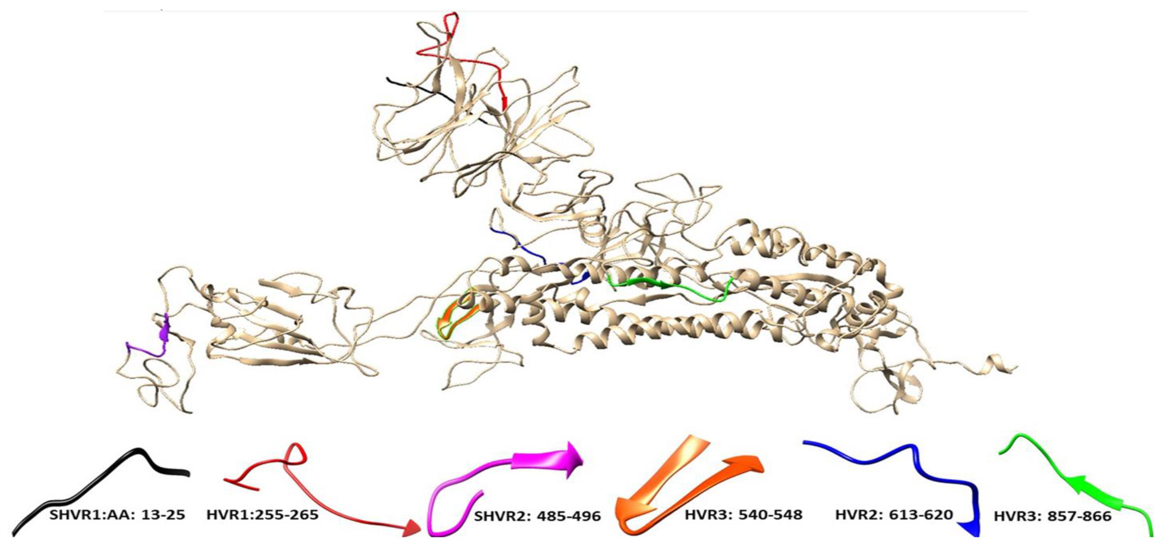 The Shannon entropy variation analysis indicates the presence of three HVRs in the spike glycoprotein of SARS-CoV-2, including HVR1 in the N-terminal domain at positions 255-265, HVR2 in the S1 subunit at positions 613-620, and HVR3 in the S2 subunit at positions 857-866. HVR2 was identified as the most variable region among understudied sequences. In addition, three semi-HVRs were identified: amino acids 13 to 25 in the N-terminal domain, 485-495 in the receptor binding domain, and 540-548 in the S1 subunit.As anticipated, the C-terminus of the spike glycoprotein and amino acids surrounding the cleavage site (positions 672 to 698) exhibited the lowest variability. The Shannon entropy map and the three-dimensional structure of the spike glycoprotein amino acid sequences with different variable regions related to Iranian samples are illustrated in Figures 1 and 2.