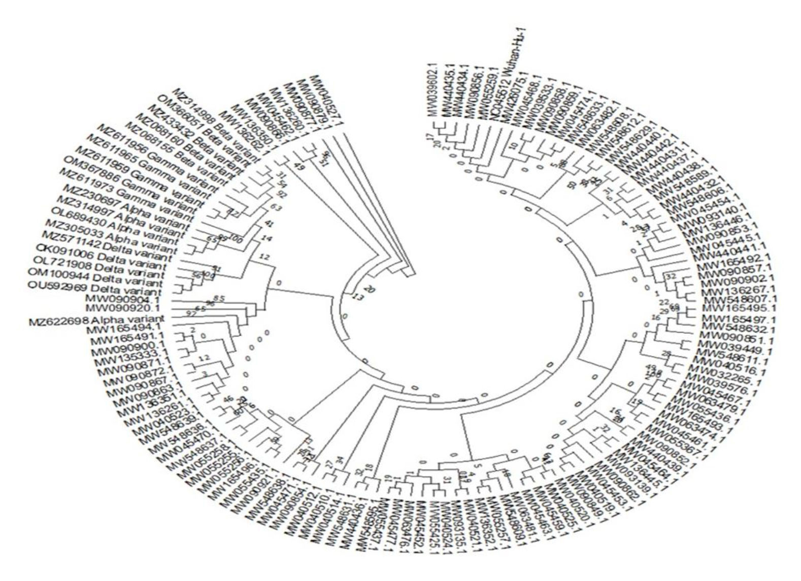 The neighbour-joining method was employed to construct the tree, with the software Mega 10 utilised for this purpose. As illustrated in Figure 3, all understudied sequences diverged from the Wuhan isolate, with some sequences demonstrating clustering with alpha variants, such as MW090904 and MW040523. The isolates MW040527, MW09087 9, MW090877, MW136260, MW045462, MW090866, MW136350, and MW136262 depicted most divergency from the Wuhan isolate, suggesting the initiation of further changes.A deeper analysis of the tree, based on topology and branches, resulted in the division of the tree into five main groups. The largest of these groups, designated Group 1, is further subdivided into Group 2. The most divergent sequence, characterised by its greater distance from the common ancestor of the sequences and the presence of more mutations and divergence, is MW045461. This sequence belongs to the first wave of the disease.The reference sequence is located in the first cluster, which is the largest cluster in Iran and contains the majority of the sequences. Cluster 5 is the smallest cluster and the sequences in it are more divergent and different than the other sequences and are closer to the common ancestor of the sequence.These sequences are MW045462 and MW090877, which are related to the second wave of corona virus infection in Iran, and an interesting point.Note the difference between these and other sequences, especially the existing sequences from the first wave of the disease. It is conceivable that these sequences may be the ancestors of certain Iranian sequences, and that other sequences may have arisen from them.