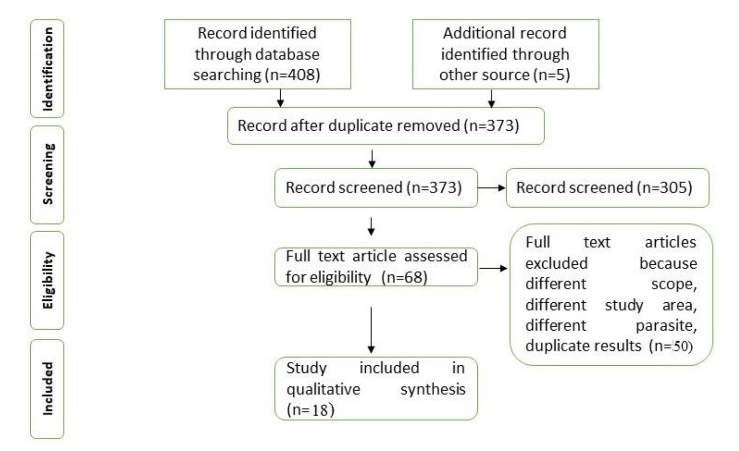 A total of 408 studies were initially identified through database searching, and an additional five articles were appended to this list by examining their reference lists. Subsequent to the removal of duplicate articles (n=40), an initial search of the titles and abstracts of the remaining articles (373 articles) was conducted. The full texts of 68 articles were then evaluated for validation. Following this, 50 articles were excluded from the review due to non-relevance to the subject, the study area being outside of Iran, the presence of parasites other than Fasciola, duplicate results, and lack of full text. Following these exclusions, 18 articles were selected according to the established entry criteria ( 2 , 3 , 5 - 8 , 11 , 12 , 14 , 15 , 17 , 18 , 22 , 23 , 25 , 27 ). Of these, only F. hepatica was reported in five articles, the species of Fasciola was not specified in four articles, and the simultaneous infection of F. hepatica and F. gigantica was reported in other articles. Of the 18 studies conducted on fasciolosis, 11 articles employed molecular tests such as the melting point curve of high-quality genomic material (HRM), standard polymerase chain reaction (PCR), loop-mediated amplification (LAMP), restriction fragment length polymorphism (RFLP), and multiplex PCR. Conversely, serological tests were utilized in only two studies, while morphology tests were employed in five studies. The serological studies that employed commercial kits and natural cathepsin L utilized the aforementioned methods to detect Fasciola (Table 1). A total of seven articles were identified as pertaining to the prevalence of fasciolosis. The prevalence of fasciolosis was most frequently reported in goats, followed by sheep, cattle, and humans (Table 1). This study revealed that fasciolosis has been documented in sheep, cattle, goats, buffalo, and humans in the provinces of Tehran, Ardabil, Fars, Gilan, Khuzestan, Sistan and Baluchestan, Bushehr, Mazandaran, Golestan, Alborz (Karaj), Lorestan, Ilam, West Azerbaijan, East Azerbaijan, Qom, Qazvin, Yazd, Isfahan, Kermanshah, and Razavi Khorasan. The prevalence of fasciolosis in humans has exhibited geographical variation, ranging from 1.7% in Golestan to 2.4% in Sistan and Baluchistan.